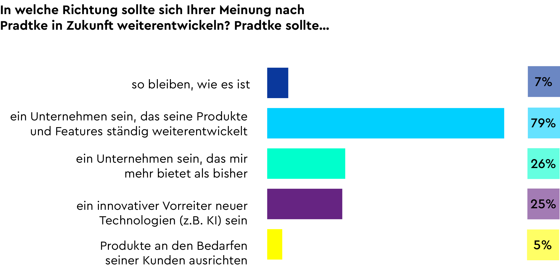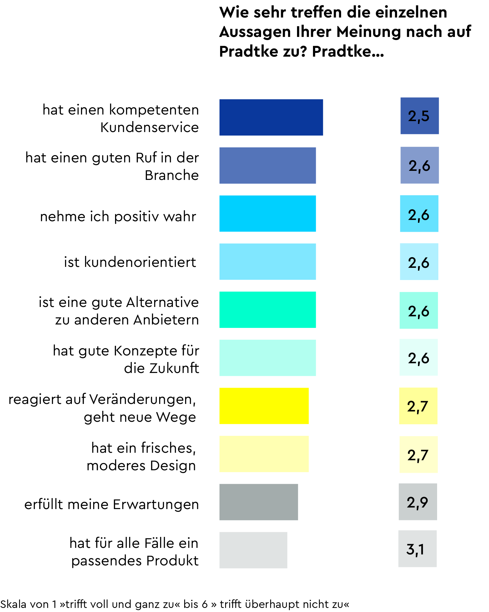 Für uns ist es zentral zu verstehen, womit wir überzeugen, und an welchen Stellen wir unsere Kunden einfach noch besser oder anders unterstützen sollten. Daher haben wir die Teilnehmenden gebeten, Pradtke entlang bestimmter Aussagen einzuschätzen: