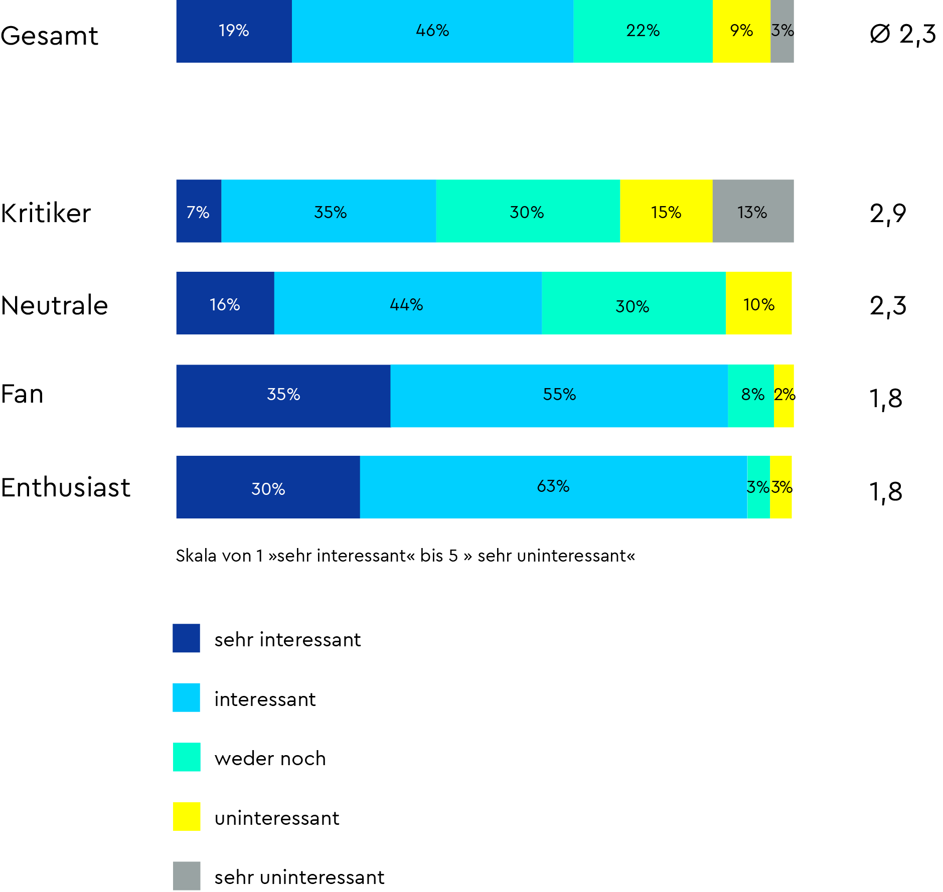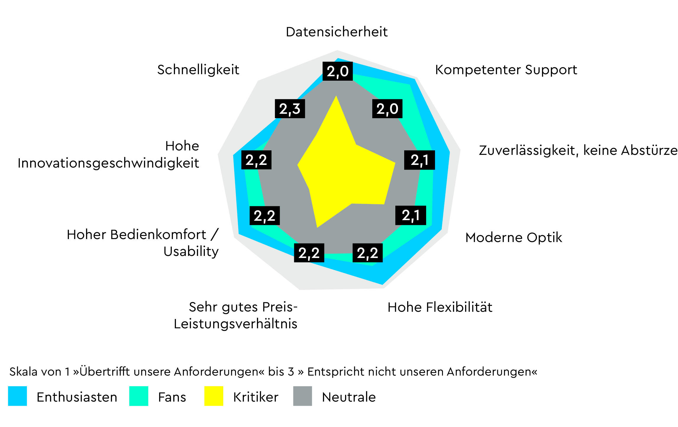 Mit Hilfe dieser Fragestellungen und Gewichtungen konnten wir verschiedene prototypische Kunden (Buyer Personas) identifizieren. Dabei haben sich neben den sogenannten „Neutralen“ auch „Fans“ und „Enthusiasten“ sowie „Kritiker“ herauskristallisiert. Die Betrachtung der Ergebnisse entlang dieser vier Gruppen verändert die Bewertung der Eigenschaften deutlich. Deshalb schauen wir uns die Personas im folgenden genauer an.