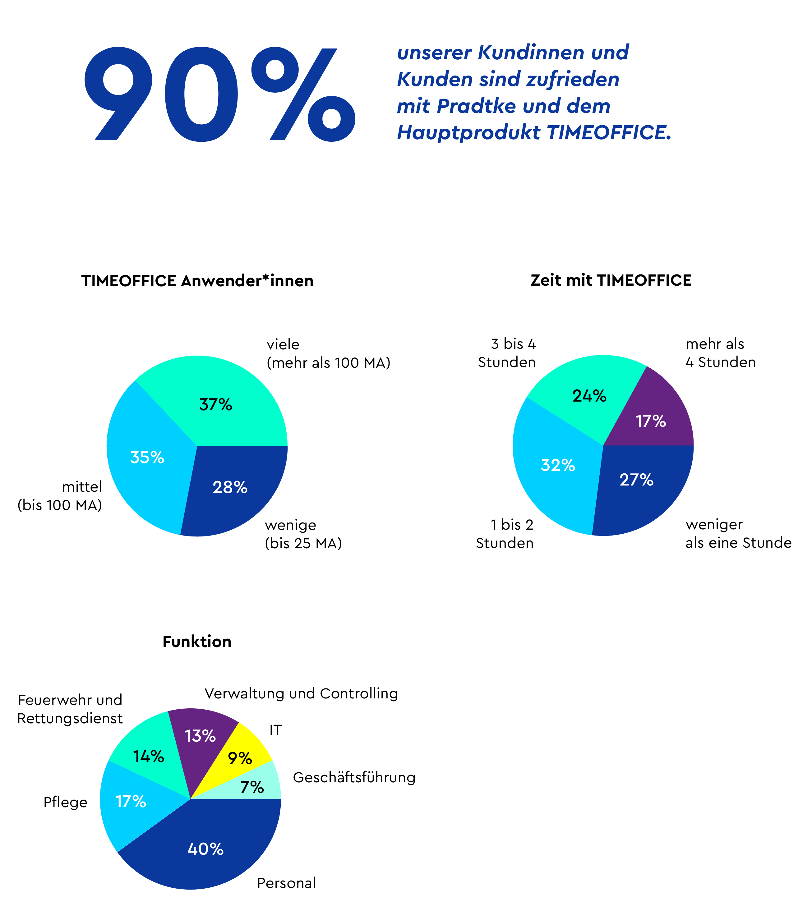 Neben der hohen Zufriedenheit der Kundinnen und Kunden mit dem Hauptprodukt TIMEOFFICE von 90 Prozent lässt sich auch ableiten, dass Menschen, die häufiger und länger mit der Software arbeiten, prinzipiell zufriedener sind als diejenigen, die das Programm seltener nutzen.